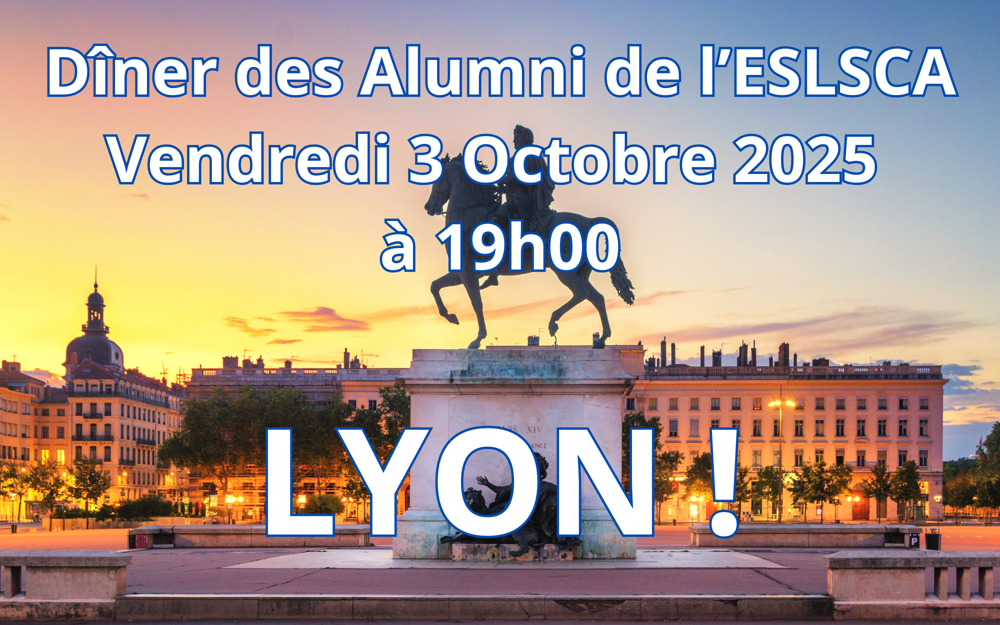 L'Association ESLSCA Alumni, accompagnée d'une équipe au niveau local (merci à eux !) organise une soirée des Alumni de l'ESLSCA sur Lyon le Vendredi 3 Octobre 2025 à 19h - DERNIERE CHANCE POUR T'INSCRIRE !